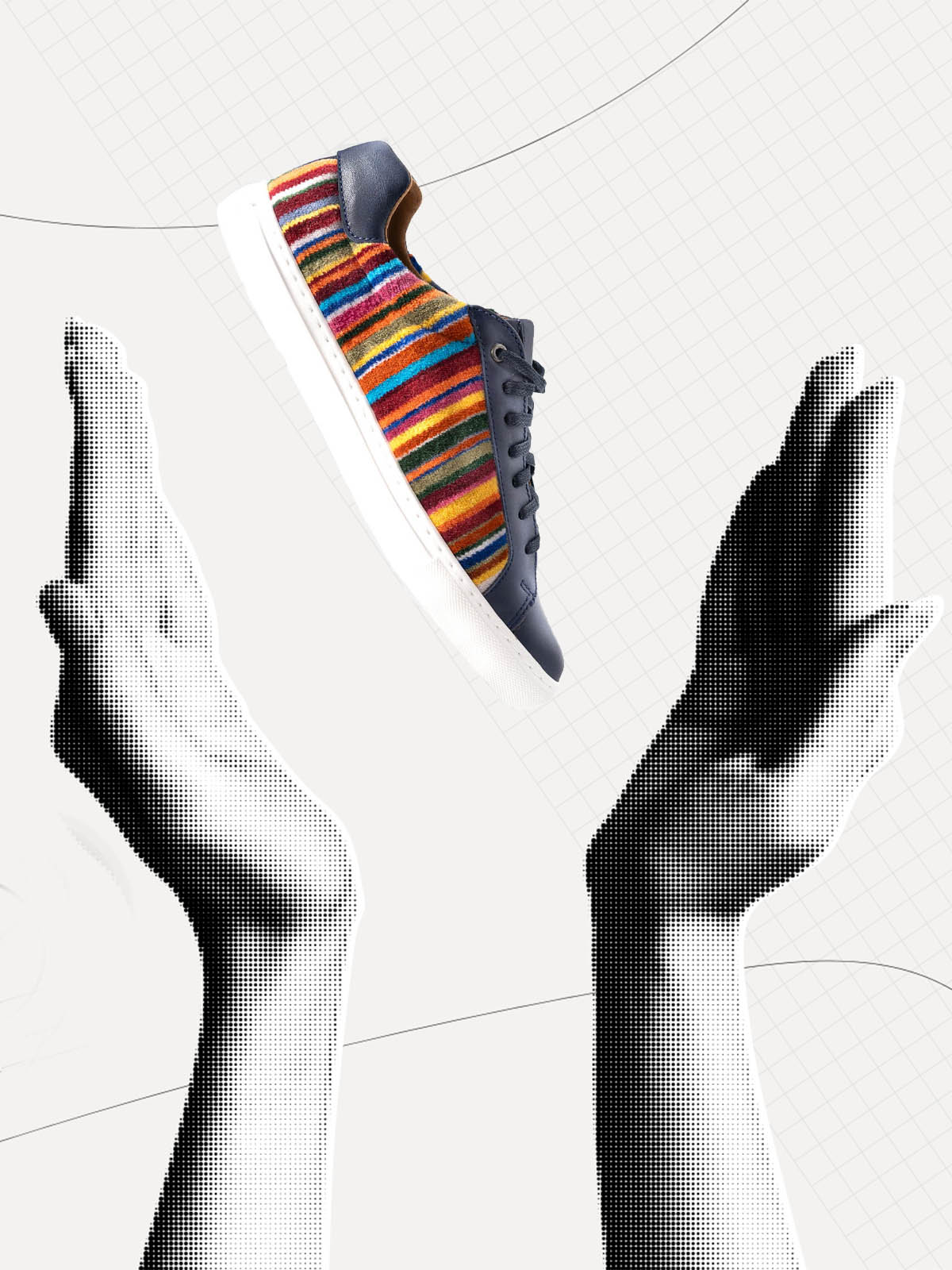 Découvrez nos Sneakers manufacturées à partir des tissus surcyclés du Métro, du Tramway, des Bus et Trains de cité français.